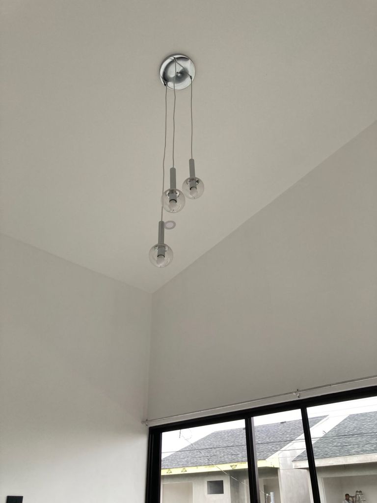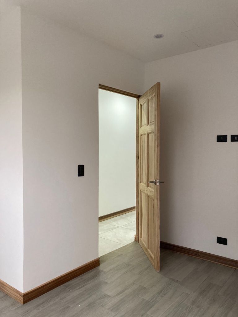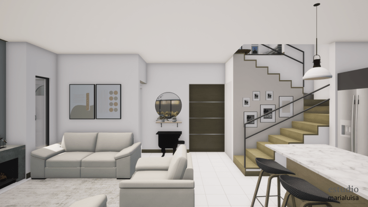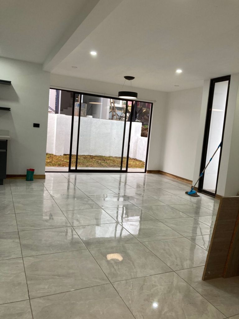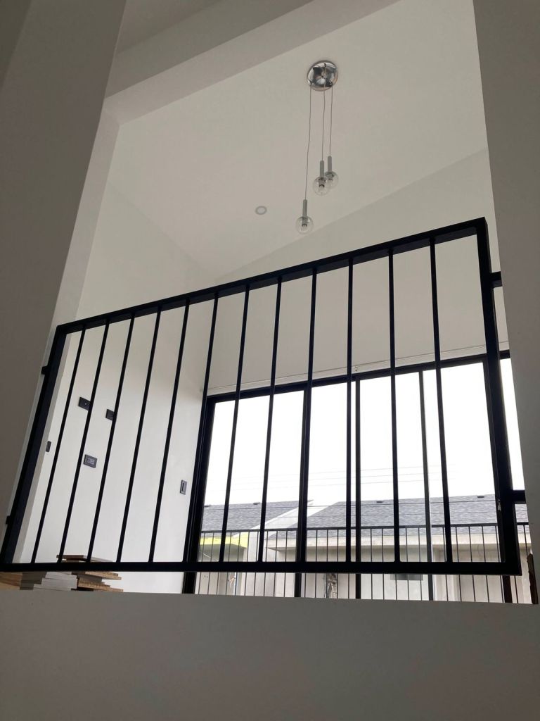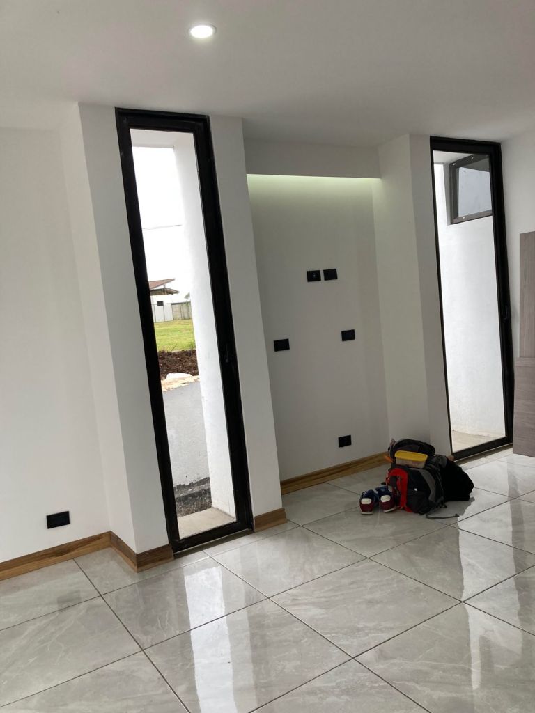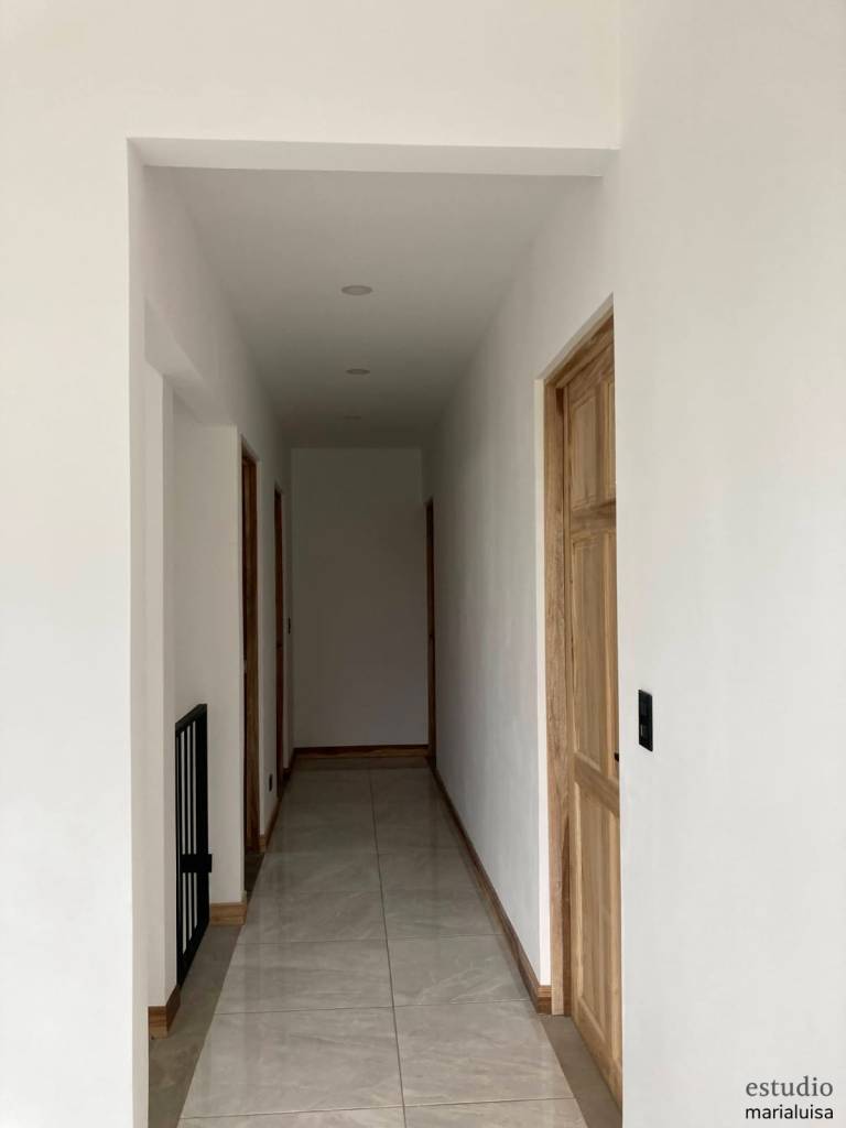 Tomamos algunas fotos finalizando la obra , podemos observar cielo altos en la zona de estar, el área del pasillo del segundo nivel, acabados en madera, marcos y barandas negras, paredes blancas que en un futuro se pueden personalizar mas si así lo desean