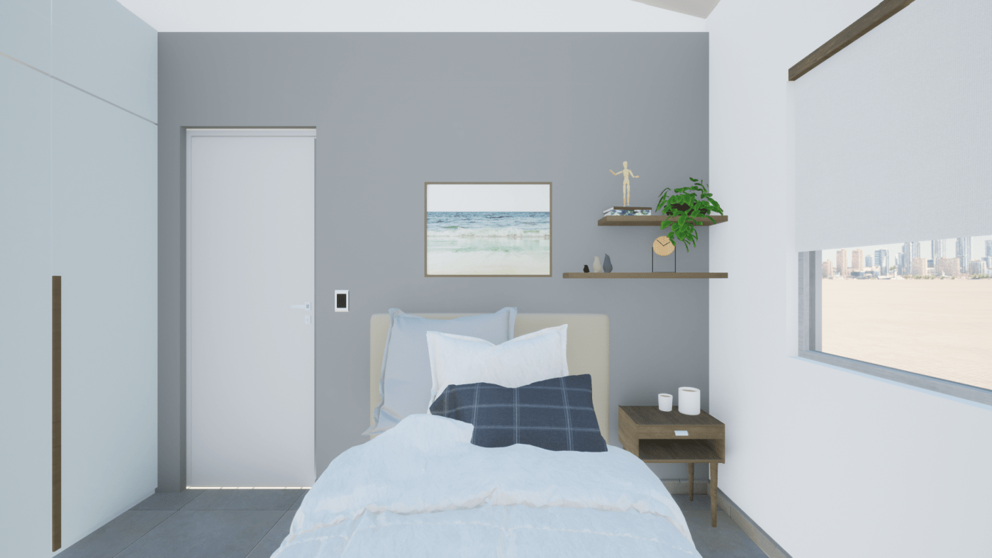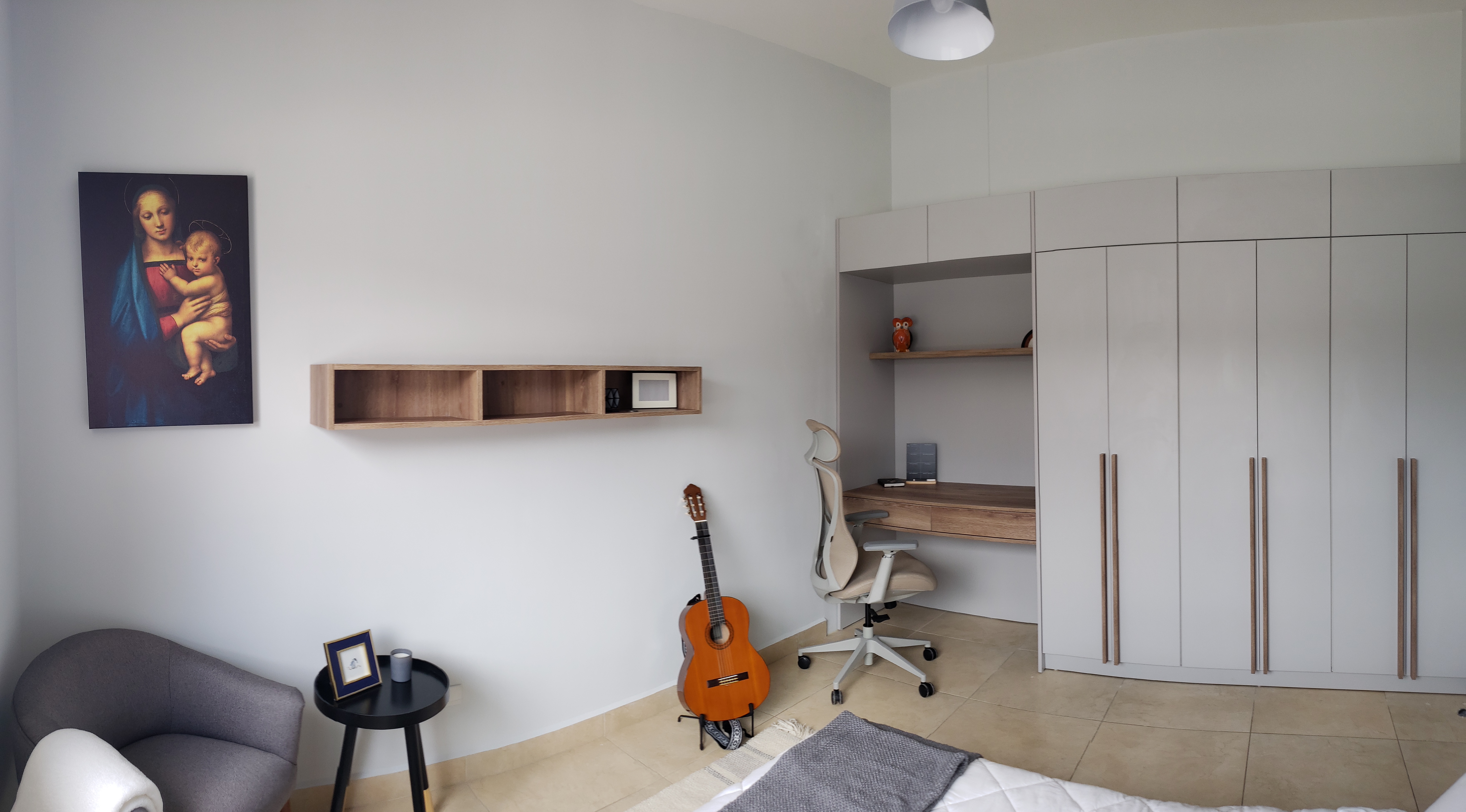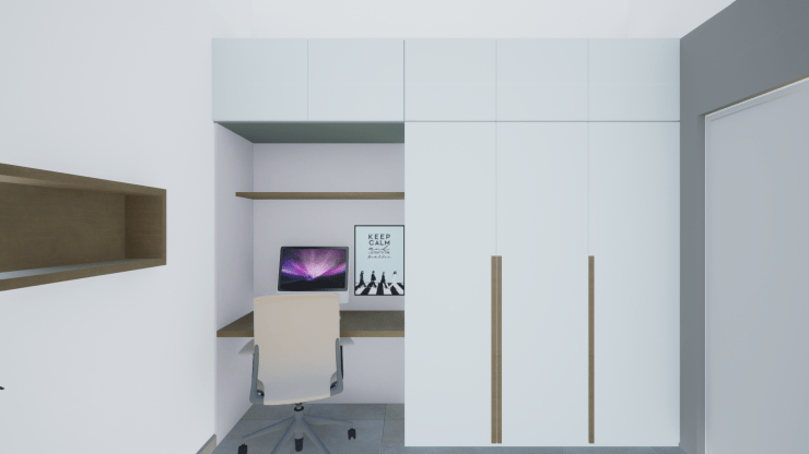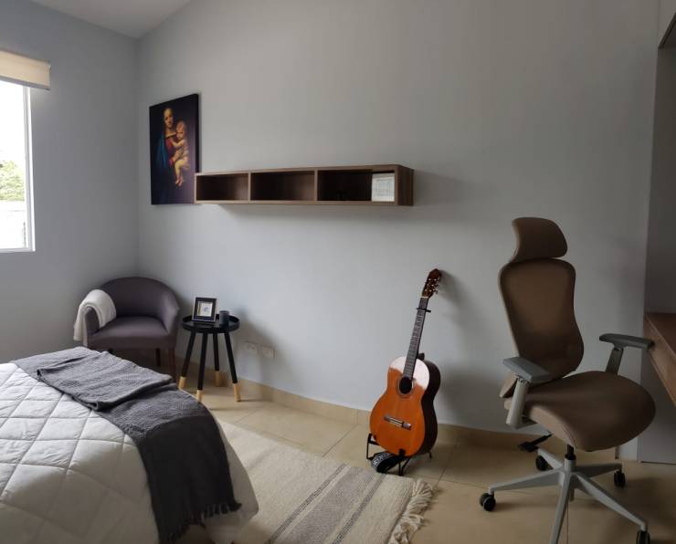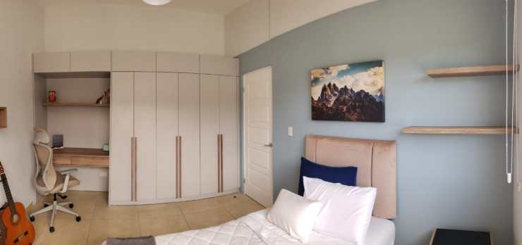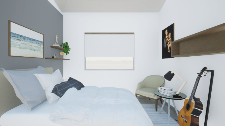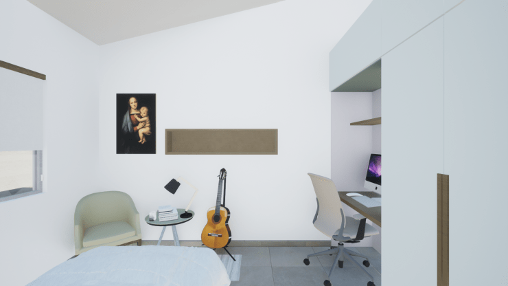 Daniel quería un dormitorio con colores neutros y pocos elementos visuales. Parte importante de la propuesta se centraba en buscar un equilibrio entre un espacio de estudio y el espacio de descanso, sin olvidar la importancia de la necesidad de almacenamiento.
