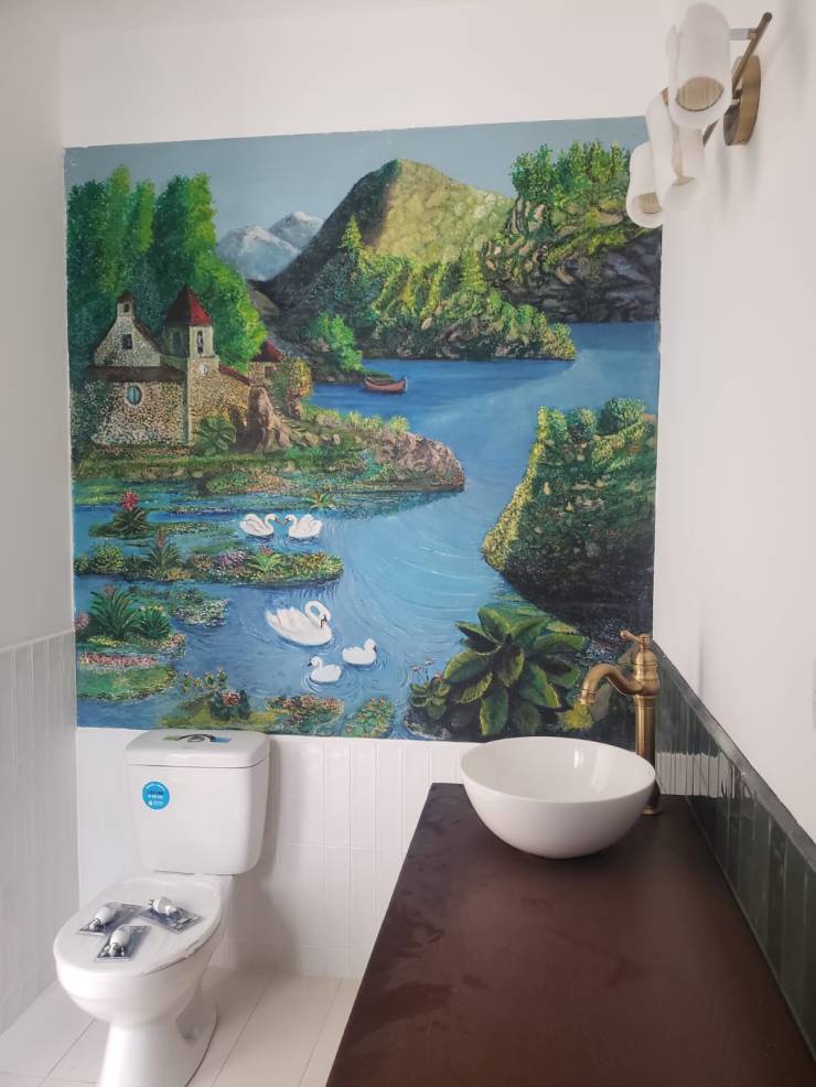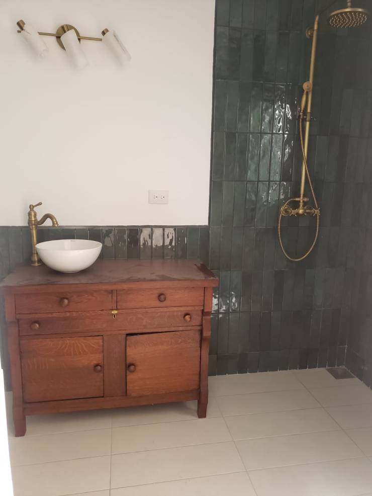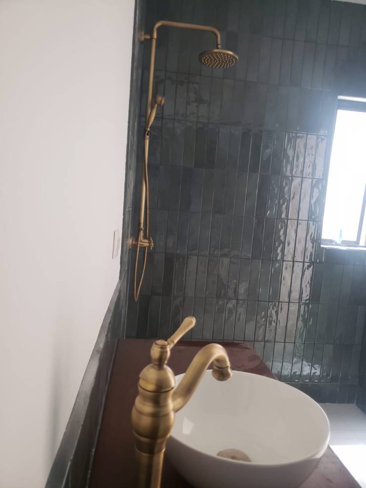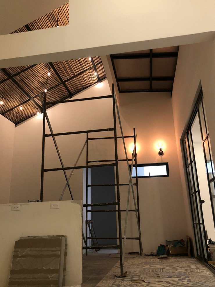 Se realizaron varios cambios para mejorar tanto la funcionalidad como la estética del lugar. Una de las principales adiciones fue la construcción de una hermosa terraza con techos altos hechos de bambú. Además de la terraza, también decidimos renovar los baños, optamos por acabados en dorado para agregar un toque de lujo y sofisticación durante la remodelación, también nos aseguramos de preservar la pintura existente en el baño. Parte del proceso, lo podemos ver acá: